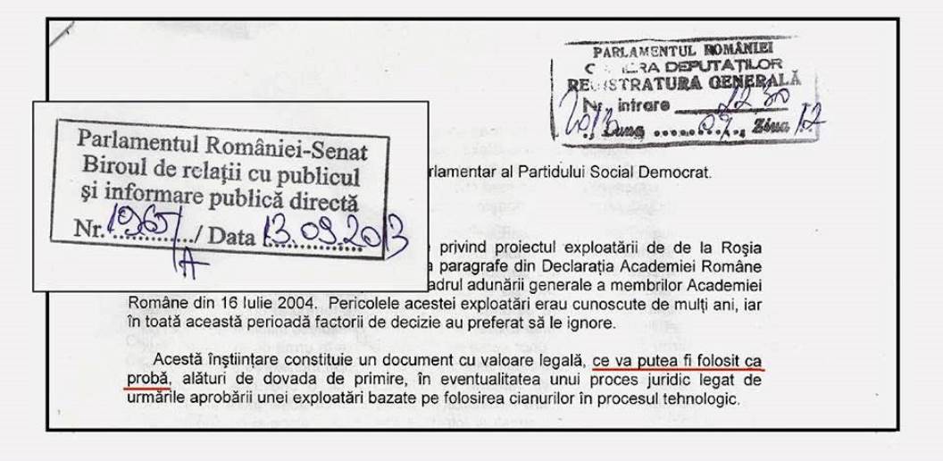 Azi am depus atât la Camera Deputaţilor cât şi la Senat, către toţi parlamentarii, un document cu dovadă de primire, care include fragmente din declaraţia Academiei din vara anului 2004, cu privire la proiectul exploatării de aur din Roşia Montana.